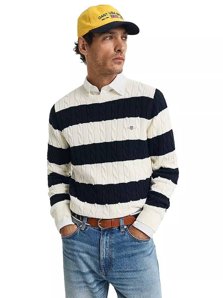 Dieser GANT Herren Pullover aus 100 % Baumwolle mit weichem Griff ist im Regular Fit geschnitten und ein Klassiker der American Sportswear. Er besticht durch ein durchgehendes Streifenmuster in Zopfstrickstruktur, einen Rundhalsausschnitt sowie gerippte Abschlüsse an Ärmeln und Saum. Eine aufgestickte GANT-Wappengrafik auf der Brust rundet das Design ab. Mit der Entscheidung für unsere Baumwollprodukte unterstützen Sie die Investition von GANT in die Mission von Better Cotton. Dieses Produkt wird über ein System der Massenbilanz bezogen und enthält daher möglicherweise keine Better Cotton.