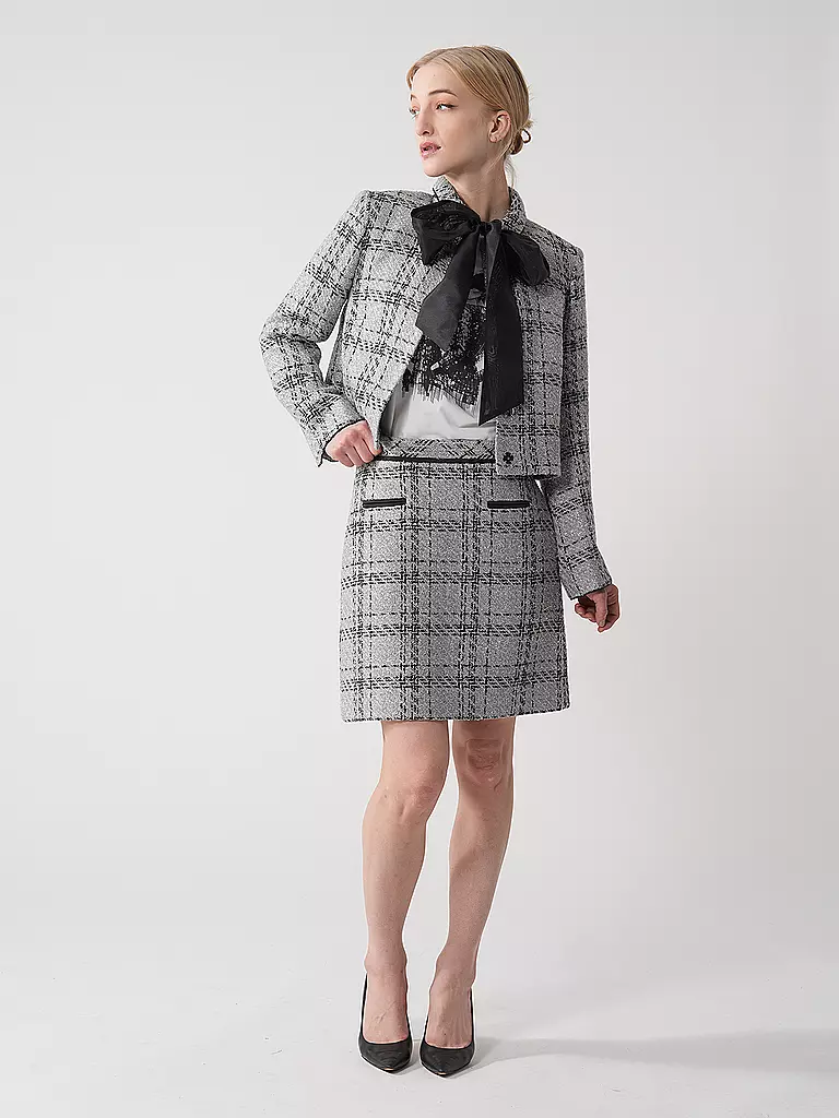 Diese karierte Jacke erhält durch schimmernde Lurex-Details einen Hauch von Exklusivität. Das markante Design wird durch eine große, einfarbige Schleife am Kragen stilvoll akzentuiert. Die figurnahe Cropped-Silhouette und die geschlitzten langen Ärmel verleihen der Jacke eine moderne Note. Verdeckte Druckknöpfe sorgen für einen dezenten Verschluss.