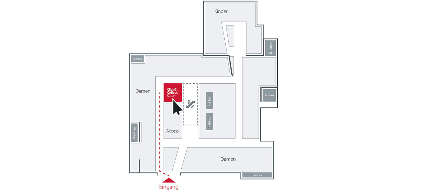 Grundriss mit den verschiedenen beschrifteten Bereichen: Damen, Kinder, Zugang und Click & Collect Zone rot hervorgehoben. Ein Pfeil zeigt vom „Eingang“ in Richtung Click & Collect Zone und suggeriert einen Weg.